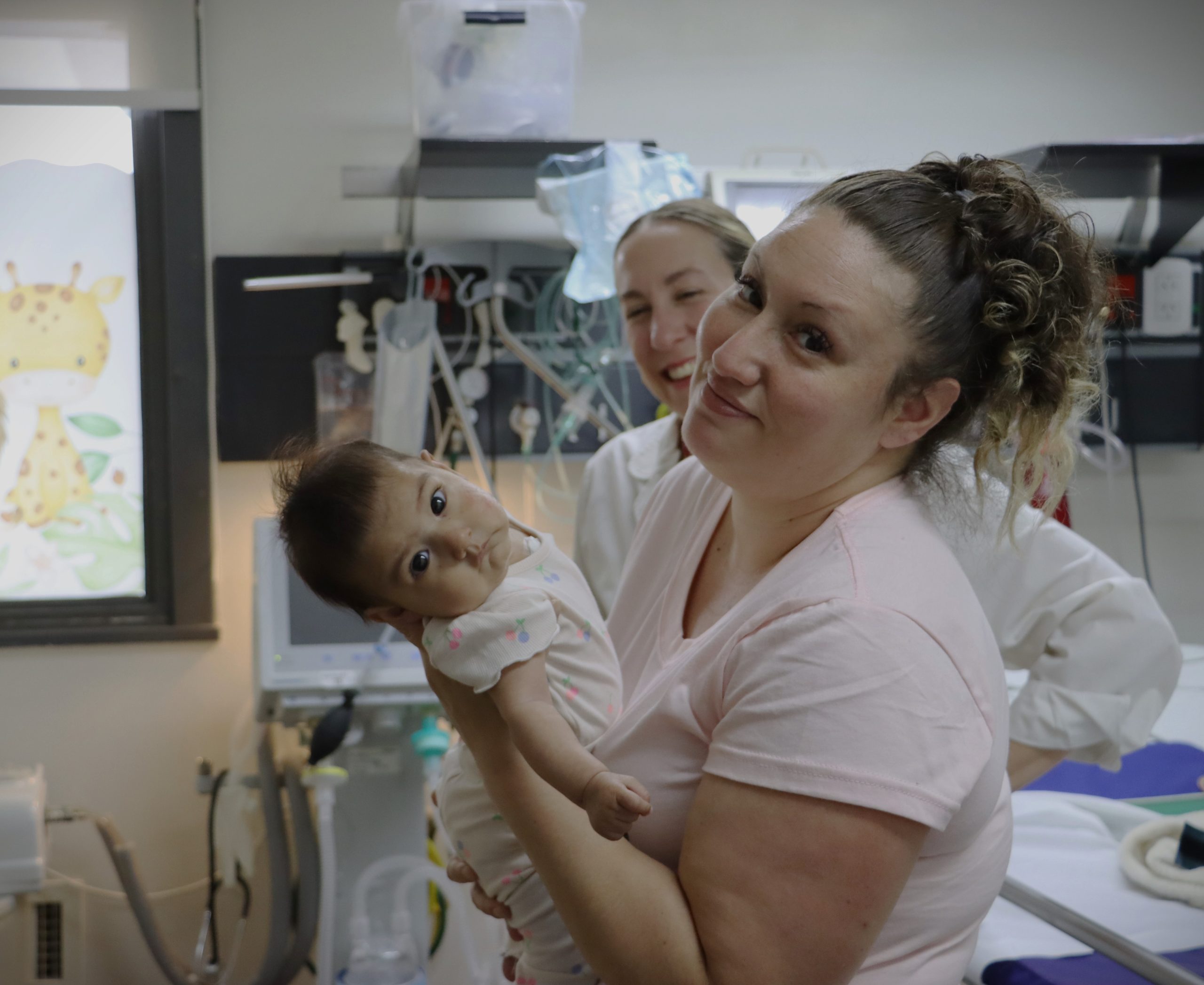 Angelina Tolaba Rincón nació en nuestro sanatorio a las 37 semanas y fue diagnosticada con Tetralogía de Fallot, una cardiopatía congénita compleja que dificulta la correcta oxigenación de la sangre. Permaneció 15 días en Neonatología y luego recibió el alta con un seguimiento conjunto de Cardiología y Nutrición Pediátrica hasta alcanzar el peso óptimo para la intervención.